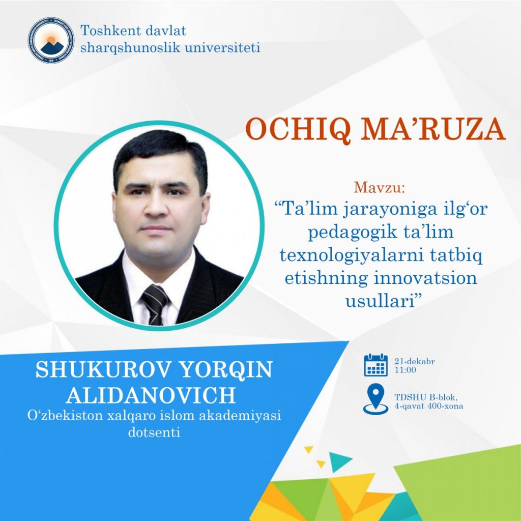 Ma’ruzachi: SHUKUROV YORQIN ALIDANOVICH -O’zbekiston xalqaro islom akademiyasi Arab tili va adabiyoti al-Azhar kafedrasi dotsenti, pedagogika fanlari bo’yicha falsafa doktori (PhD)