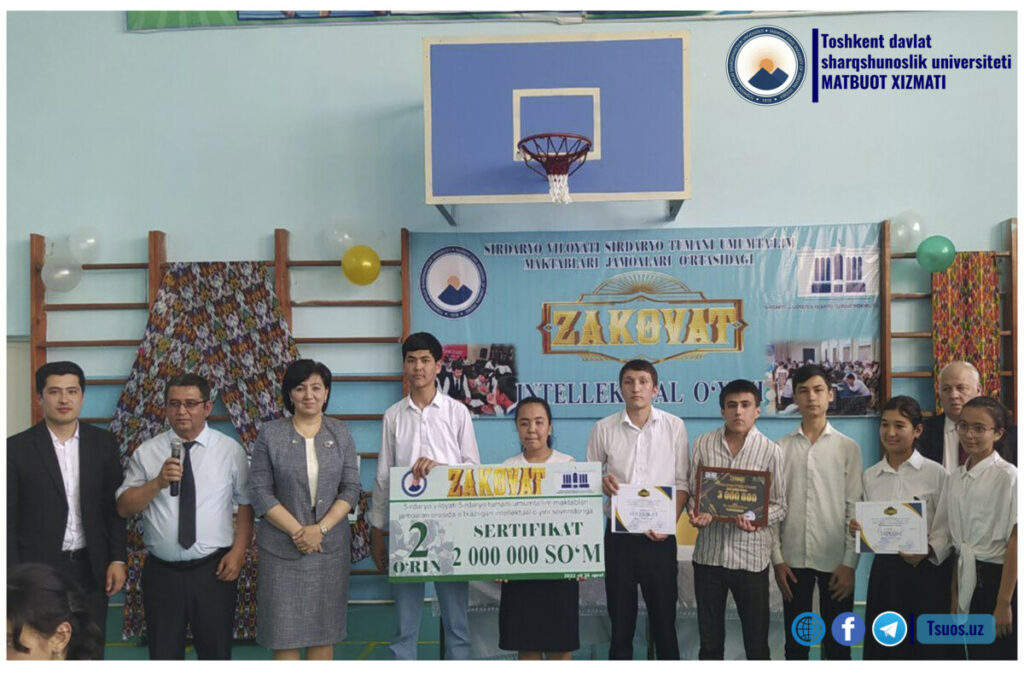 Sirdaryo tumanida Toshkent davlat sharqshunoslik universitetiga biriktirilgan maktablar o‘rtasida o‘tkazilayotgan «Zakovat» bellashuvining tuman birinchiligi o‘zi nihoyasiga yetdi. Turnirda 18 ta jamoa ishtirok etdi. Turnir so’ngida g’olib bo’lgan jamolar hamda ishtirokchilar pul yutuqlari hamda qimmatbaho sovg’alar bilan taqdirlandi.
