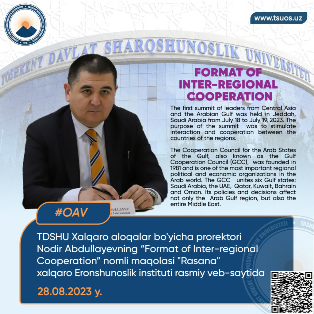 Toshkent davlat sharqshunoslik universiteti prorektori N.Abdullayevning «Mintaqalararo hamkorlik formati» nomli maqolasi Saudiya Arabistonining “Rasana” xalqaro Eronshunoslik instituti rasmiy veb-saytida nashr etildi.