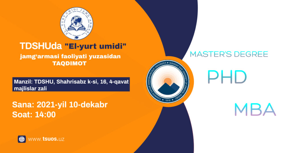 Toshkent davlat sharqshunoslik universitetida 2021-yil 10-dekabr kuni soat 14:00 da Mutaxassislarni xorijda tayyorlash va vatandoshlar bilan muloqot qilish bo‘yicha «El-yurt umidi» jamg‘armasi faoliyati to‘g‘risida TАQDIMOT tadbiri bo‘lib o‘tadi.