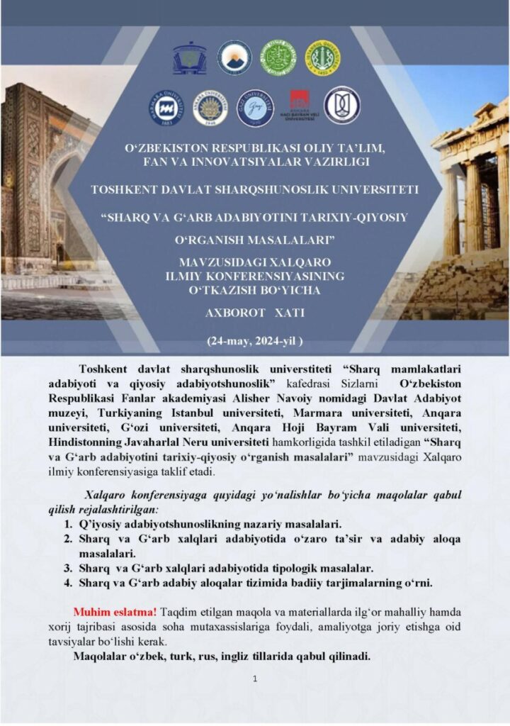 Toshkent davlat sharqshunoslik universtitetida OʻzR Fanlar akademiyasi Alisher Navoiy nomidagi Davlat Adabiyot muzeyi, Turkiyaning Istanbul universiteti, Marmara universiteti, Anqara universiteti, Gʻozi universiteti, Anqara Hoji Bayram Vali universiteti, Hindistonning Javaharlal Neru universiteti hamkorligida “Sharq va Gʻarb adabiyotini tarixiy-qiyosiy oʻrganish masalalari” mavzusidagi Xalqaro ilmiy konferensiya bo‘lib o‘tadi.