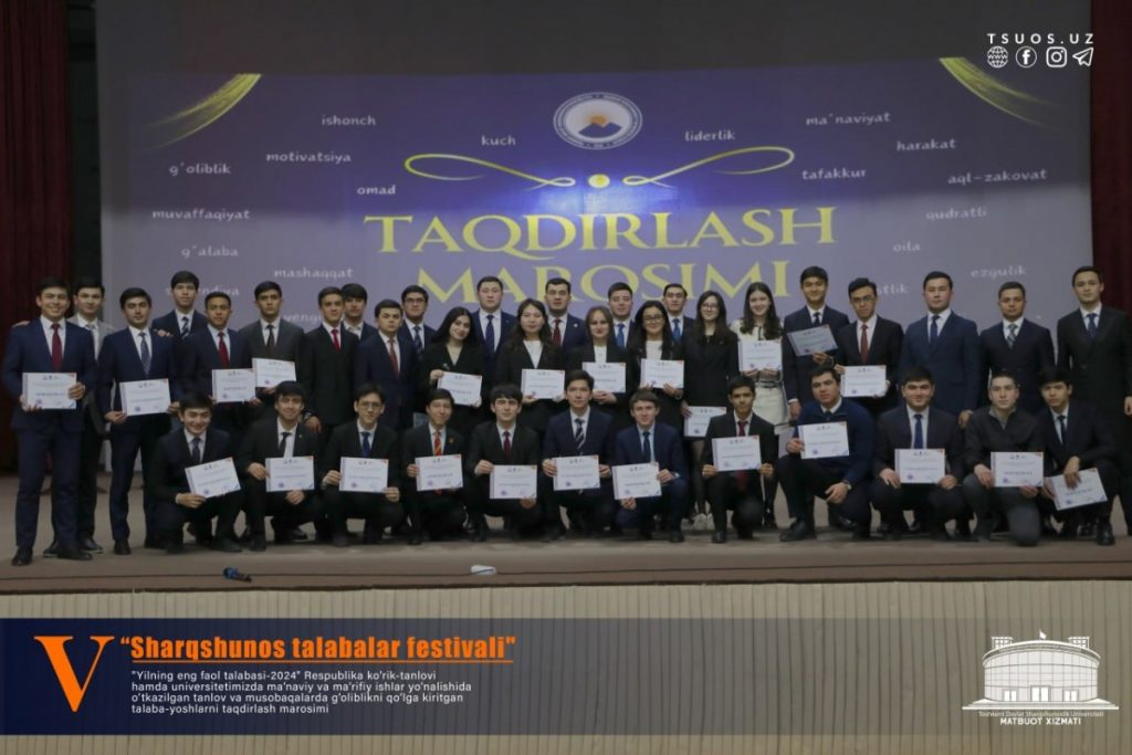 TDSHU yoshlar ittifoqi boshlangʻich tashkiloti Kengashi tashabbusi, universitet rahbariyati qoʻllab-quvvatlovi natijasida 2024-yilning noyabr-dekabr oylarida o’tkazilgan «V Sharqshunos talabalar festivali», «Yilning eng faol talabasi-2024» Respublika koʻrik-tanlovi hamda universitetimizda ma’naviy va ma’rifiy ishlar yoʻnalishida oʻtkazilgan tanlov va musobaqalarda gʻoliblikni qoʻlga kiritgan talaba-yoshlarni taqdirlash marosimi bo’lib o’tdi.