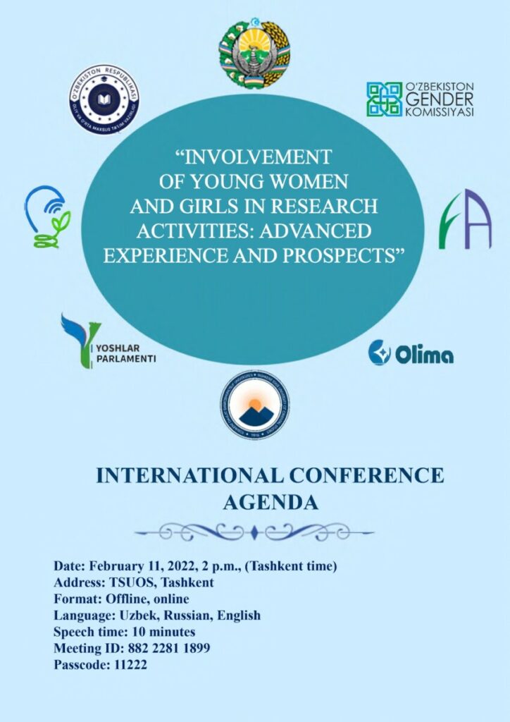 2022-yil 11-fevral soat 14:00da TDSHUda “Yosh ayol-qizlarni ilmiy-tadqiqot faoliyatiga jalb etish: ilg‘or tajriba va istiqbollar” mavzusida Xalqaro anjuman bo‘lib o‘tadi.
