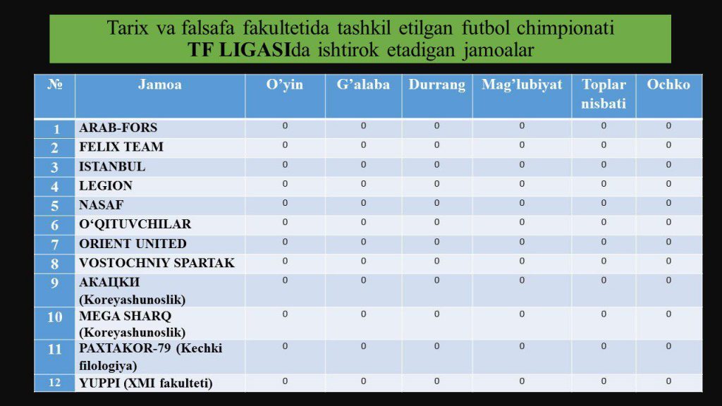 Tarix va falsafa fakultetida tashkil etilgan futbol chimpionati TF LIGASIda ishtirok etadigan jamoalar: