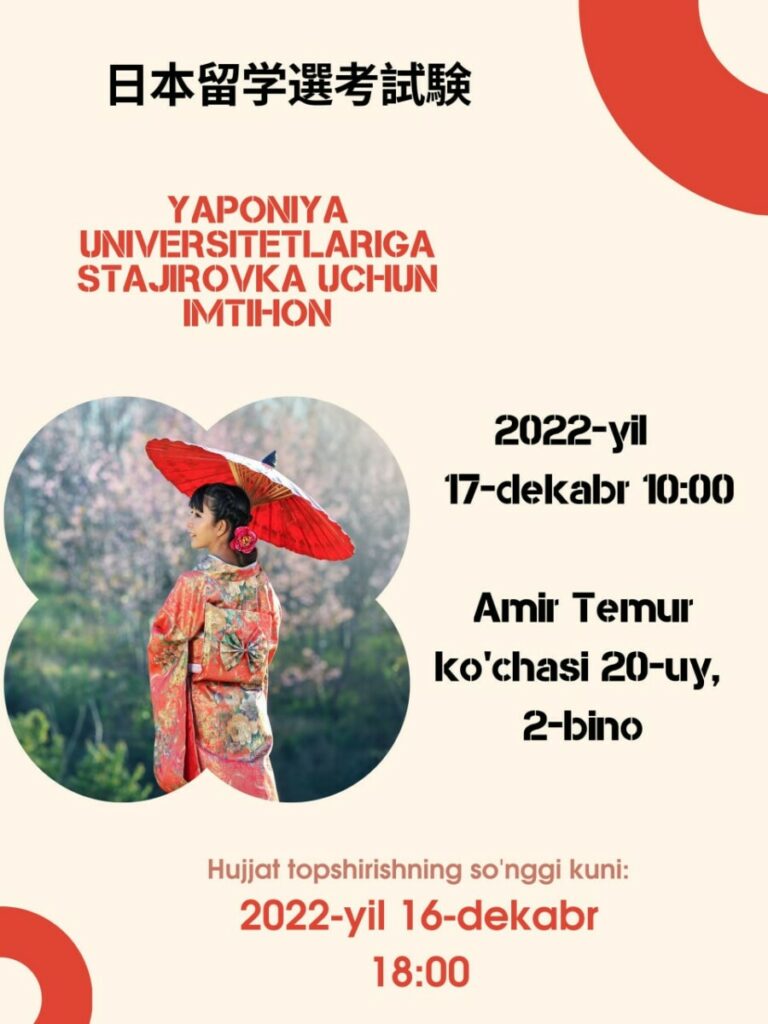 2022-yil 17-dekabr soat 10:00 da Toshkent davlat sharqshunoslik universitetida Yaponiyada stajirovka oʻtash uchun imtihoni boʻlib oʻtadi.