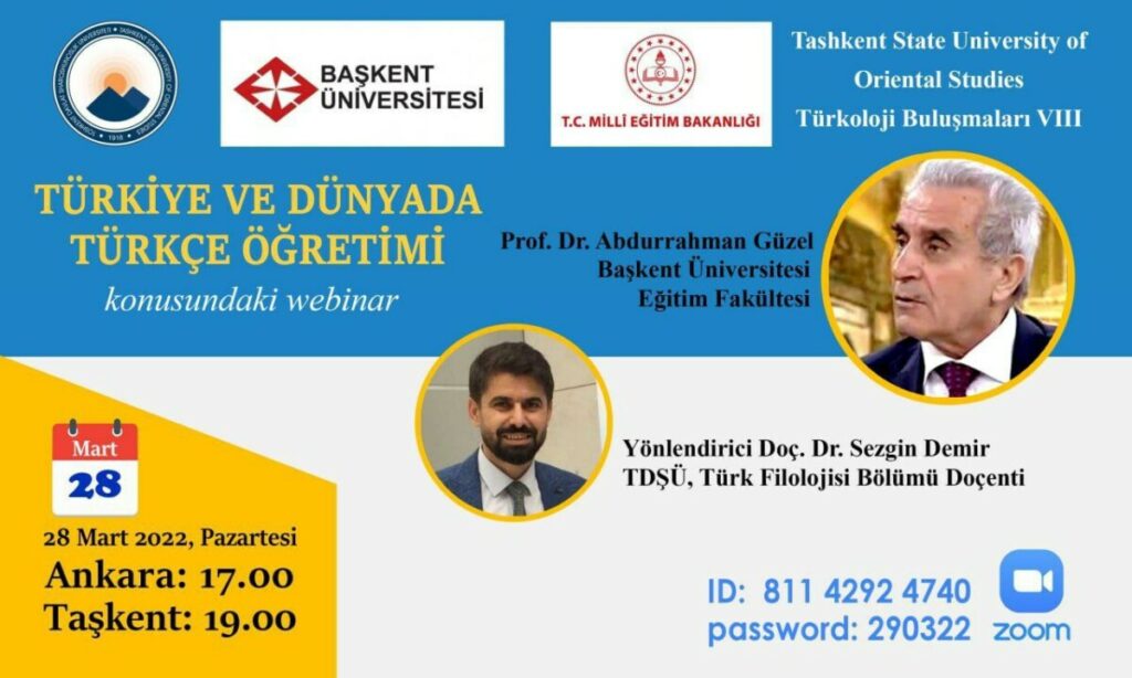 2022-yilning 28-mart kuni soat 19:00da Bashkent universiteti professori Abdurahmon Guzelning «Turkiya va jahonda turk tilini o’qitish metodikasi» mavzusidagi vebinari tashkil etilmoqda.