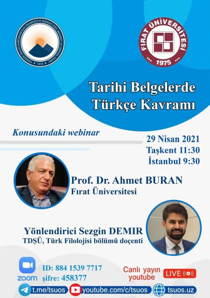📢 2021-yilning 29-aprel kuni soat 11:30da «Turk filologiyasi» kafedrasi tomonidan turkshunos mutaxassislar uchun Turkiyaning Firat universiteti professori Ahmad Buranning «Turk tilining tarixiy hujjatlardagi mohiyati» mavzusidagi vebinari tashkil etilmoqda. Shu sohaga qiziquvchi barcha professor-o’qituvchilarni taklif etamiz✅