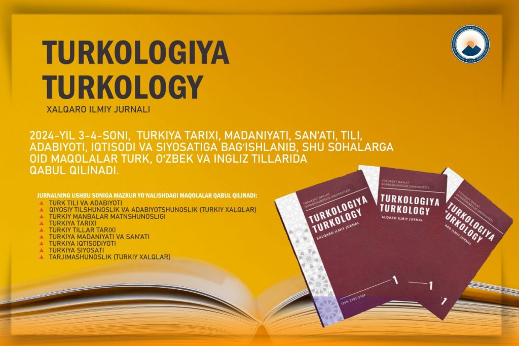 “Turkologiya. Turkology” xalqaro ilmiy jurnalining 2024-yil 3-4-soni, Turkiya tarixi, madaniyati, san’ati, tili, adabiyoti, iqtisodi va siyosatiga bag‘ishlanib, shu sohalarga oid maqolalar turk, o‘zbek va ingliz tillarida qabul qilinadi.