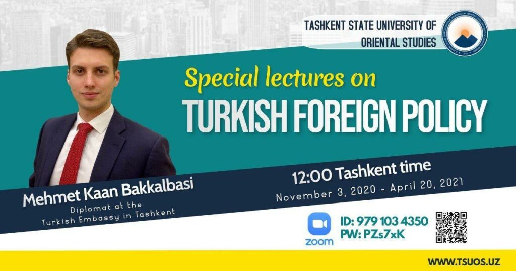 ⚡️⚡️2020-yilning 3-noyabridan 2021-yilning 20-apreliga qadar Turkiya Respublikasining O‘zbekistondagi Elchixonasining 3-kotibi, siyosiy masalalar bo‘yicha bo‘lim boshlig‘i Mehmet Kaan Bakkalbashining Toshkent davlat sharqshunoslik universiteti turkshunos talabalariga “Turkiya tashqi siyosati” mavzusi doirasidagi turkum ma’ruza mashg‘ulotlari o‘tkaziladi.