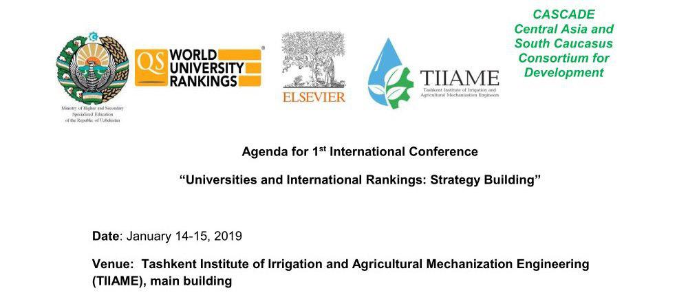 2019-yilning 14-15-yanvar kunlari O’zbekiston Oliy va o’rta maxsus ta’lim vazirligi, World University rankings, Elsevier, CASCADA tashkilotlari hamkorligida Toshkent irrigatsiya va qishloq xo’jaligi mexanizatsiyalash muhandislari institutida “Universitetlar va xalqaro reytinglar: strategiyani yaratish” birinchi xalqaro konferensiyasi o’tkaziladi. Konferensiyada ishtirok etish uchun ro’yxatdan o’tish havolasi: https://docs.google.com/forms/d/1NhobqZCjfbndZjXdgXSQvfEa4sqR-D86dkrGIYrueuI/viewform?edit_requested=true.