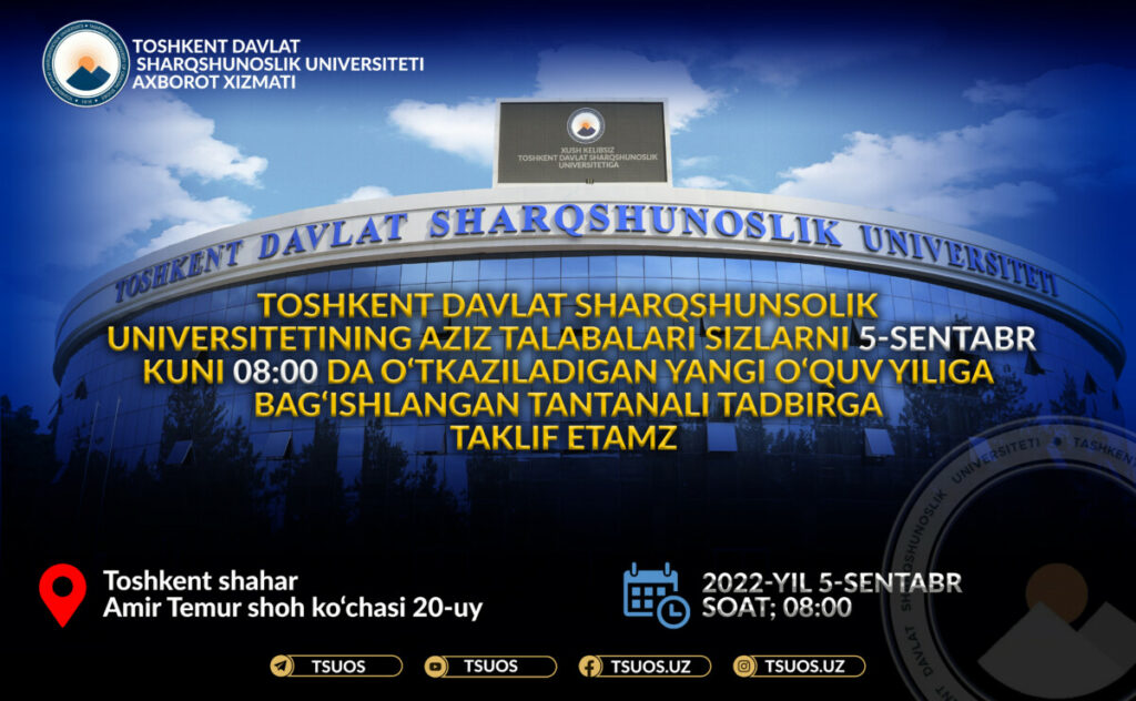 2022-2023 yangi oʻquv yilining boshlanishi munosabati bilan barcha Toshkent davlat sharshunoslik universiteti talabalarini, xususan uzoq tarixga ega bo’lgan universitetimizning talabasi bo’lish baxtiga muyassar bo’lgan 1-bosqich talabalarini 5-sentabr 08:00 da tantanali tadbirga taklif etamiz.